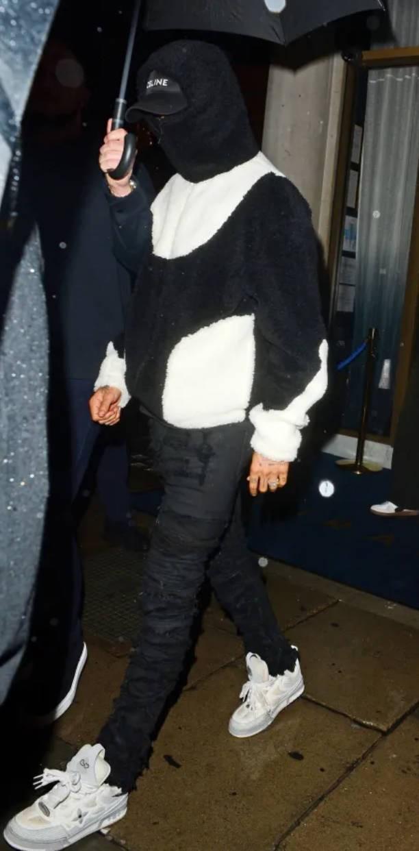 他穿着价值950英镑(约人民币9006.95元)的路易威登运动鞋和价值410英镑(约人民币3887.21元)的席琳帽子,用套头衫的兜帽遮住脸,离开餐厅后,他直接上了车离开。